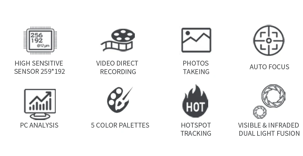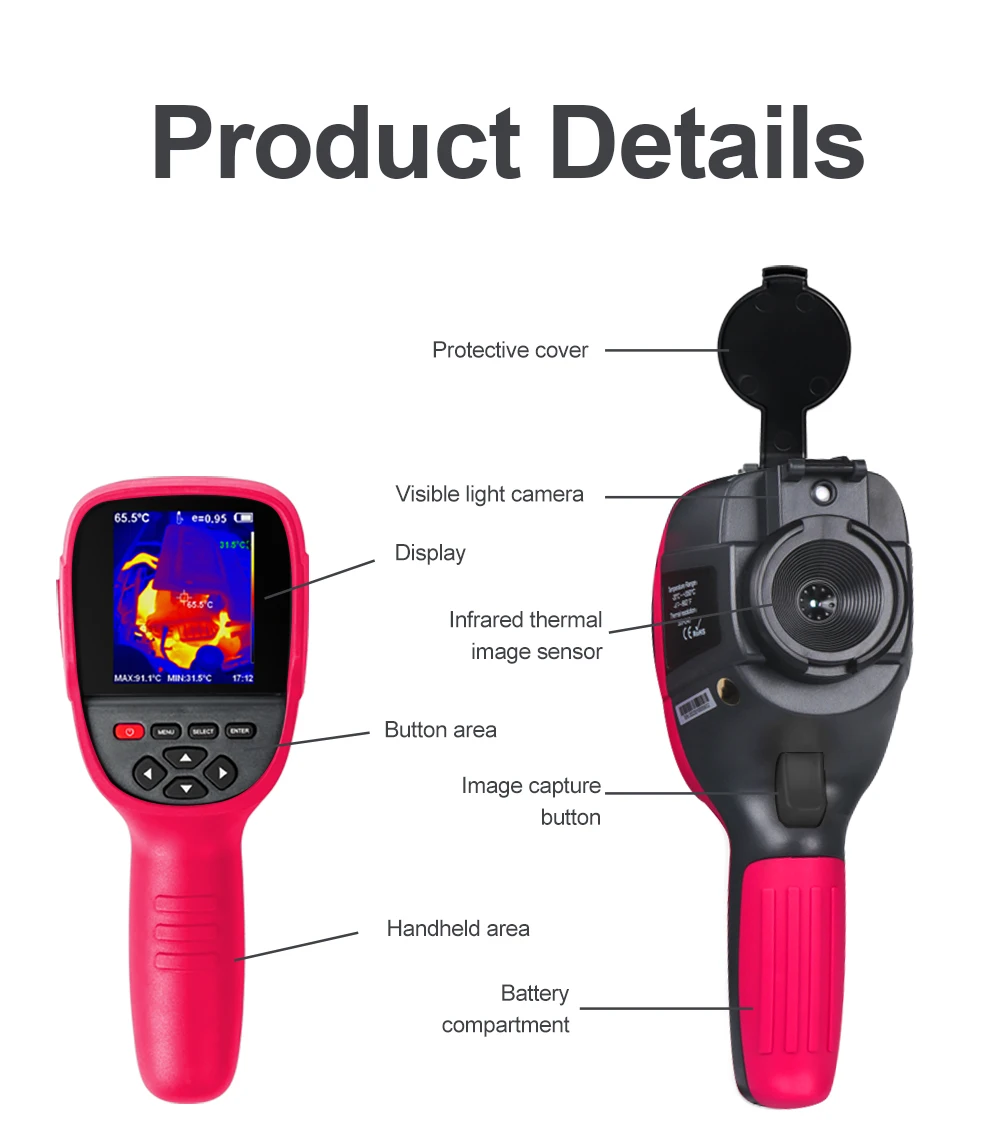 - 🎨 5 palettes d’imagerie : arc-en-ciel, fer rouge, froid, blanc chaud, noir chaud